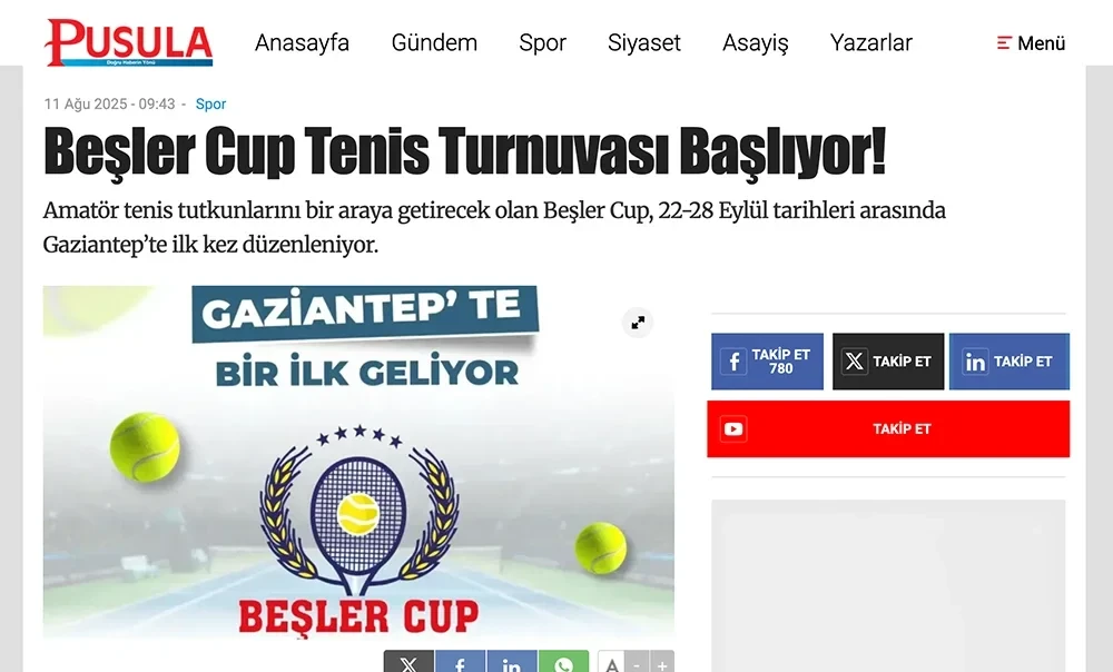 Gaziantep’te bir ilk: Beşler Cup Tenis Turnuvası başlıyor